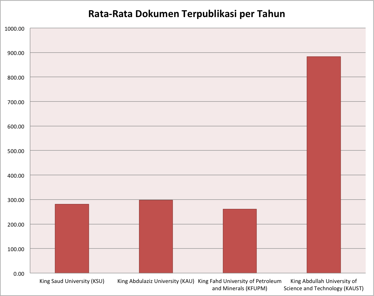 Dari rata-rata publikasi per-Author, warga KFUPM paling produktif per orangnya. Setiap orang kira-kira bisa menghasilkan 4.5 paper yang terindeks scopus. Kalau dilihat dari publikasi pertahun, warga KAUST secara berjama’ah paling produktif dibanding universitas yang lain. Setidaknya ada 883 publikasi dalam setahun atau sehari minimal dua paper terpublikasi. Kalau trend ini dipertahankan, dalam beberapa tahun kedepan, KAUST bisa jadi yang paling banyak publikasinya.