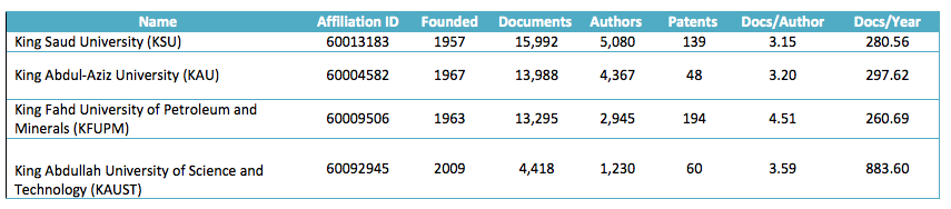 KSU merajai untuk jumlah dokumen terpublikasi. Disusul oleh KAU, KFUPM dan si bungsu KAUST. Data lebih lengkap dari publikasi terindeks SCOPUS untuk ke-empat universitas tersebut dapat dilihat dalam tabel berikut. Saya coba iseng juga menghitung publikasi per author (rata-rata kasar) dan publikasi per tahun mengingat usia universitas yang berbeda-beda.